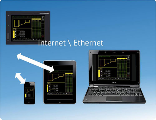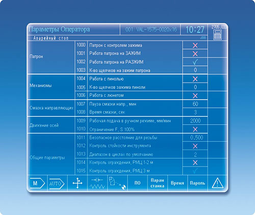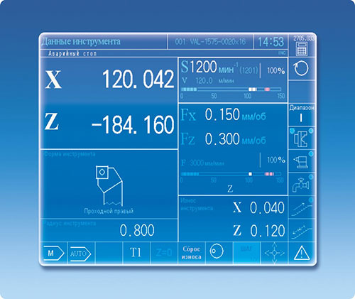 Немаловажным является тот факт, что в ОСУ реализованы функции, позволяющие учитывать различные факторы, влияющие на качество. К примеру, реализована возможность подключения дополнительно внешних измерительных систем по осям Х и Z (круговых или линейных датчиков обратной связи). Также система способна воспринимать такие параметры как радиус скругления при вершине режущего инструмента, безопасное расстояние до резьбы, люфт в механизмах перемещения, тип используемого патрона, вид смазки направляющих, ограничение рабочей зоны. Система автоматически пересчитывает корректирующие значения и учитывает их при обработке детали. При этом удобное и простое меню диагностики своевременно оповещает оператора о нештатных ситуациях, посредством специального интерфейсного окна, в котором отображается текущее состояние системы. Контроль работы станка также может осуществляться через Internet или локальную сеть.