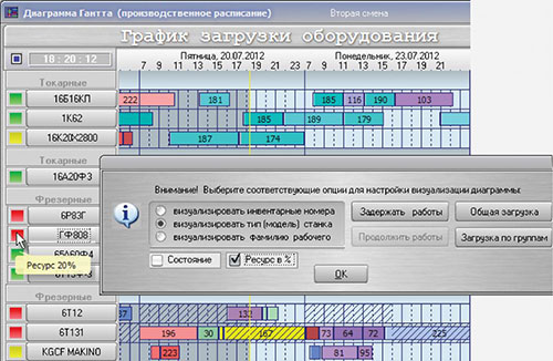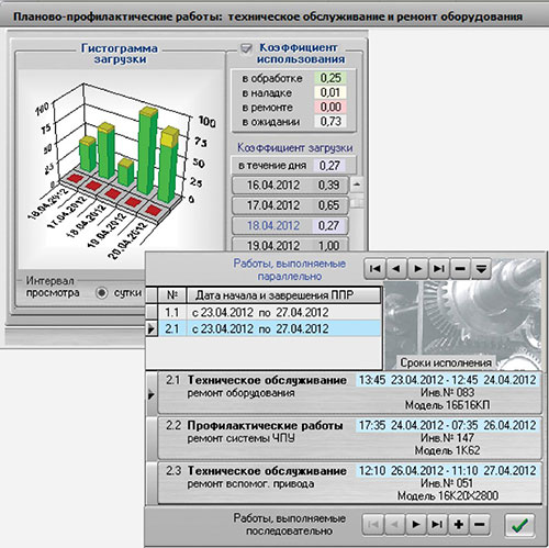 Для того, чтобы диспетчер мог аргументировано назначить время начала работ ППР, предусмотрен просмотр гистограммы ежедневной загрузки оборудования. Это позволяет выбирать время наименьшей загрузки станка и назначить этот день в качестве начальной даты проведения ППР. Таким образом, оптимизируя управление процессом производства по методу вычисляемых приоритетов, быстро формируется эффективный график проведения ППР, в котором все операции назначаются и рассматриваются диспетчером, как и обычные технологические операции. Естественно, что определяя время и место ППР в графике производства, MES-система учитывает текущий остаточный ресурс оборудования, его загруженность и существующее производственное расписание на данном участке.