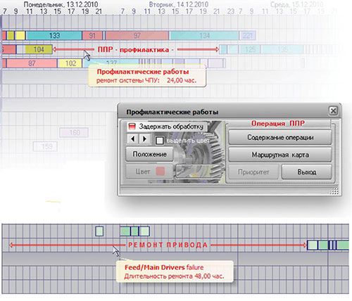 MES-система «ФОБОС», учитывая заданные нормы времени для ремонтных работ, позволяет не просто отслеживать план–график проведения ППР, а даже оптимизировать его на уровне цеха: операции планово-предупредительного ремонта распределяются по обслуживаемому оборудованию совместно с основными технологическими операциями с учетом тех рамок, за которые не должно выходить время их начала и окончания согласно основному графику ППР.