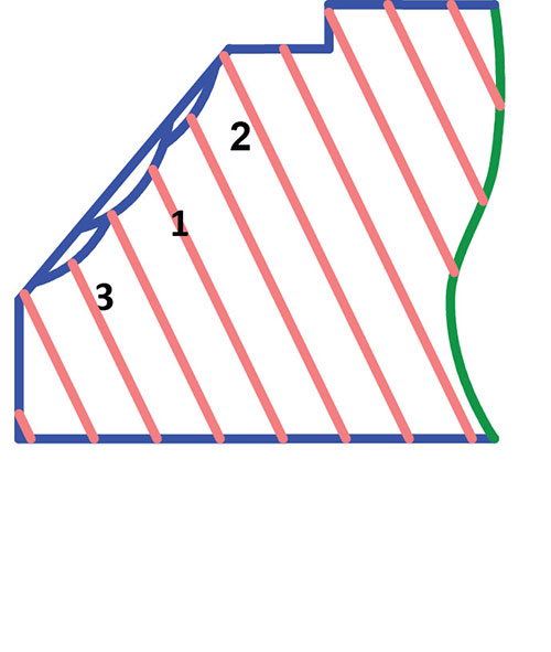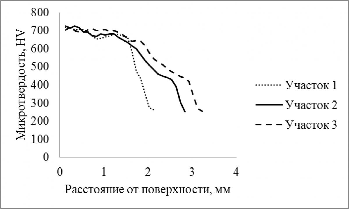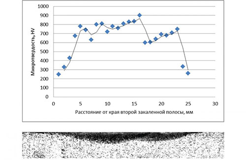 На образце из стали 20Х13 (рис. 9) с шагом 7 мм закалили три полосы, приготовили шлиф и изучили микротвердость закаленного слоя (рис. 10). Можно отметить, что глубина упрочненного слоя на двух участках закаленных в последнюю очередь, больше, чем на первом участке, что объясняется автоподогревом образца во время закалки. Поверхностные слои на всех трех участках имеют высокую твердость.