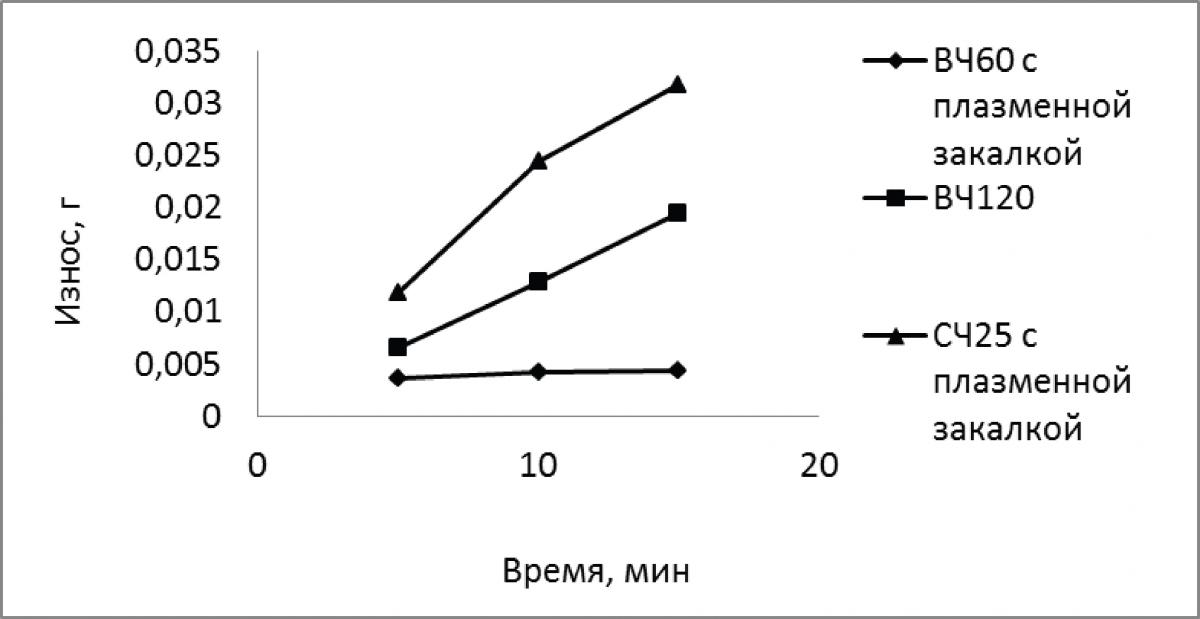 Для испытаний на износостойкость на машине трения по схеме «диск-колодка» были приготовлены колодки из различного чугуна: ВЧ120, ВЧ60, СЧ25, а диски — из стали 30ХГСА (HB 330). Половина колодок была упрочнена плазменной закалкой. Испытания проводились без смазки 4 цикла по 5 мин. Результаты представлены на рис. 12 [10].