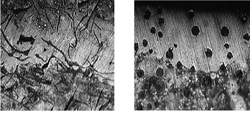 Рис. 13. Микроструктура слоя плазменной закалки на чугунах: СЧ25 (слева) и ВЧ60 (справа). Увеличение в 100 раз.