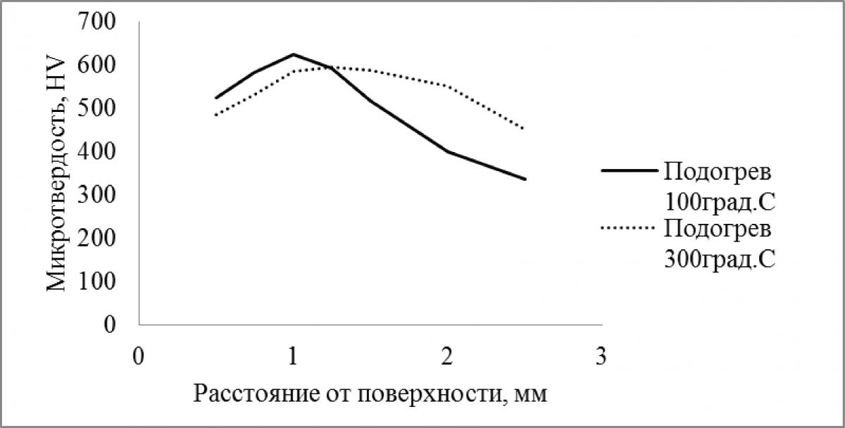 Рис. 6. Влияние подогрева на микротвердость плазменной закалки головки рельса.