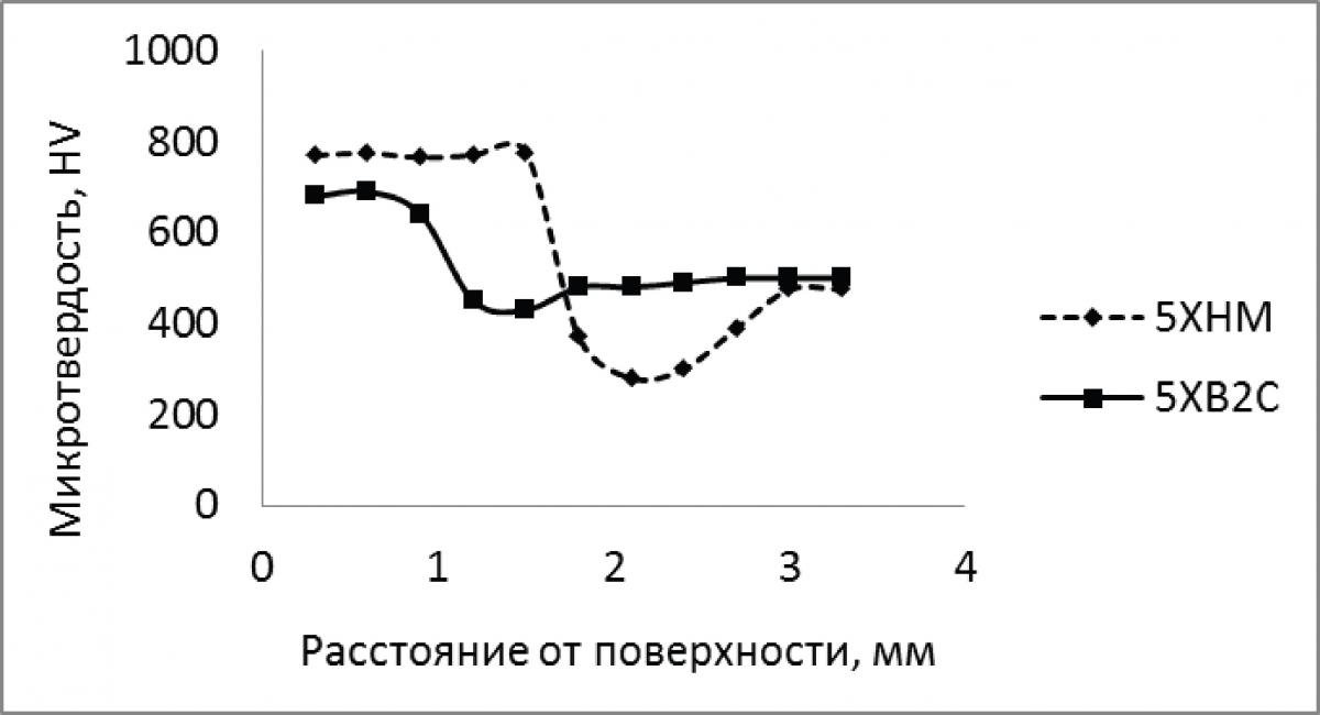 одного и того же уровня. Но в предварительно упрочненных образцах на границе слоя плазменной закалки имелось снижение твердости ниже начального уровня (рис. 8). Это связано с нагревом до температур высокого отпуска. Можно отметить, что разупрочнение стали 5ХНМ произошло в большей мере (до HV 280), чем стали 5ХВ2С (до HV 400), что указывает на более высокую жаропрочность последней.