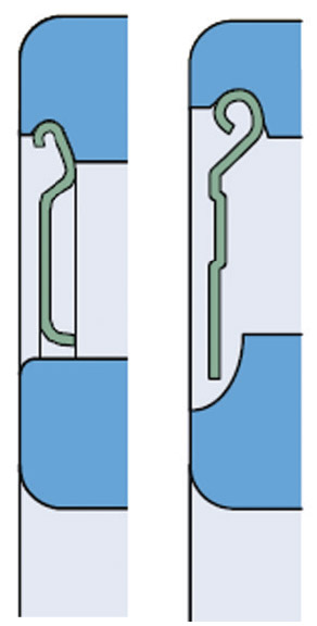 Основной недостаток контактных уплотнений — сравнительно высокие потери на трение, и, следовательно, ограничение по предельной частоте вращения. Фирма SKF разработала уплотнения малого трения (рис. 4) с повышенной защитой от внешней среды и при этом — высокой допустимой скоростью вращения (см. таблицу 1). Такие свойства достигаются благодаря минимальному зазору между кромками уплотнения и внутренним кольцом подшипника.