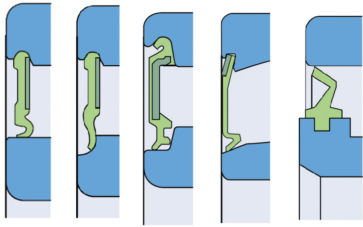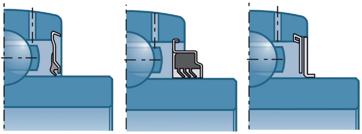 Уплотнения подшипников фирмы INA (индустриальная группа Schaeffler), SNR имеют сходную конструкцию. На рис. 8, а представлено уплотнение с уплотняющей крышкой. На рис. 8, б представлено уплотнение с тремя уплотняющими кромками и крышкой, а на рис. 8, в – бесконтактное лабиринтное. Для понимания тонкостей применения того или иного вида уплотняющей системы необходимо обратиться к каталогам и техническим консультантам фирм-изготовителей.