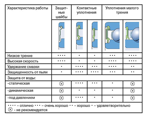 Основным достоинством защитных шайб является малое сопротивление трению. Такие подшипники применяются при высоких скоростях вращения колец. К недостаткам следует отнести слабую защищенность от пыли и невозможность работы при контакте с водой или погружении (см. таблицу 1).