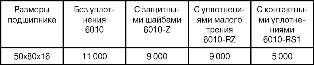 Основным преимуществом уплотнений малого трения и уплотнений с защитными шайбами производители заявляют высокую допустимую скорость вращения. В таблице 2 приведены характеристики подшипника фирмы SKF особо легкой серии 10 с диаметром внутреннего кольца 50 мм. Видно, что подшипник с контактными уплотнениями гарантированно работоспособен при числе оборотов 5000 мин–1. Такие скорости вращения удовлетворяют большинству практических приложений, а защищенность от пыли при установке контактных уплотнений существенно выше (см. таблицу 1).