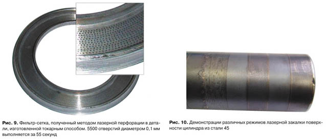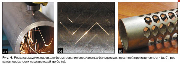На рис. 4а представлен процесс резки сверхтонких пазов шириной 0,2 – 0,25 мм в трубе из стали 45X в процессе изготовления фильтрующих элементов для нефтяной промышленности, а на рис. 4б – одно из изделий при подсветке изнутри, на рис. 4в – резка системы отверстий на цилиндрической поверхности. Примеры иллюстрируют возможность получения отверстий произвольной сложности из цилиндрических труб с высокой точностью. Такую степень точности весьма проблематично получить с помощью промышленного робота.