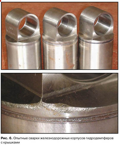 На рис. 6 приведены изображения сварки серийного изделия – гидродемпфера для системы подвески железнодорожных вагонов. Сварка корпусов с крышками произведена в рамках тестирования возможности перехода к лазерной сварке. Демостенд позволяет полностью автоматизировать процесс – автоматически выполняется три прихватки с шагом 120° и полный цикл сварки. Общее время операции 44 секунды, расчет себестоимости сварного шва при полной загрузке установки с учетом времени на установку и смену изделия около 50 рублей. Испытания на разрыв показали, что сварные швы держат нагрузку как минимум 5000 кг.