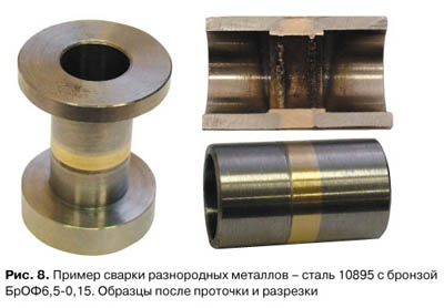 иллюстрирует возможности лазерной сварки разнородных металлов. При мощности лазера 1500 2000 Вт можно выполнять качественные соединения сталей с бронзами с толщинами стенки около 3 мм и тоже самое для меди при толщине до 2,5 мм.