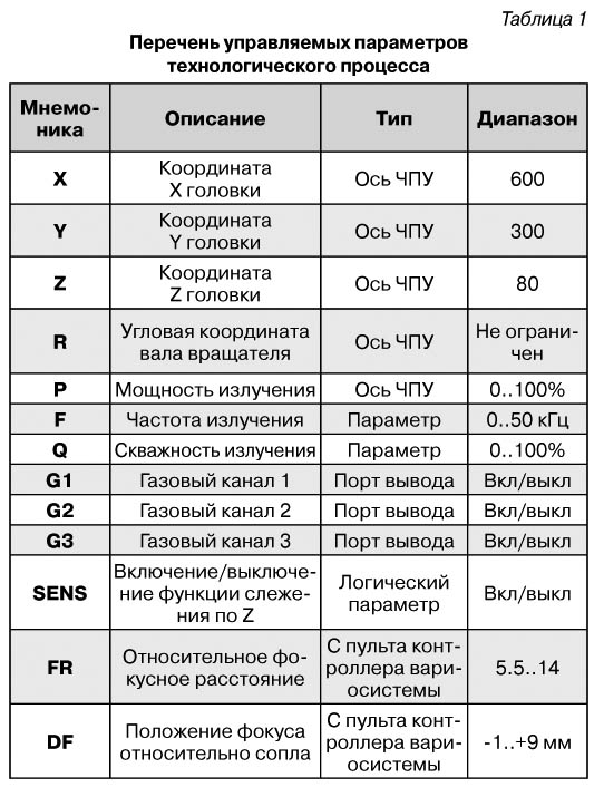 В таблице 1 представлена информация о возможности программного управления технологическими процессами, в т.ч. отдельного программирования начала отработки контура (режим врезки или входа в процесс) и режима выхода. Описанная конфигурация СПУ системы позволяла использовать для подготовки программ произвольные средства технологической подготовки, например, использовавшиеся для работы с системами лазерного раскроя. Функция управления вращателем при таком подходе обеспечивалась возможностью перенаправить управление линейной координатой (например Y) на управление угловой координатой R. При этом плоский контур движения как бы налагается на цилиндрическую поверхность детали.