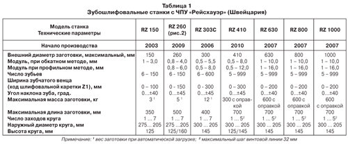 (Швейцария) – создатель метода непрерывного обкатного зубошлифования с 1945 г. специализировалась исключительно на производстве зубошлифовальных станков, работающих этим методом. Однако с целью расширения технологических возможностей своих станков фирма «Рейсхауэр» с 2009 г. стала выпускать зубошлифовальные станки, работающие как непрерывным обкатным, так и прерывистым профильным методом (таблица 1).