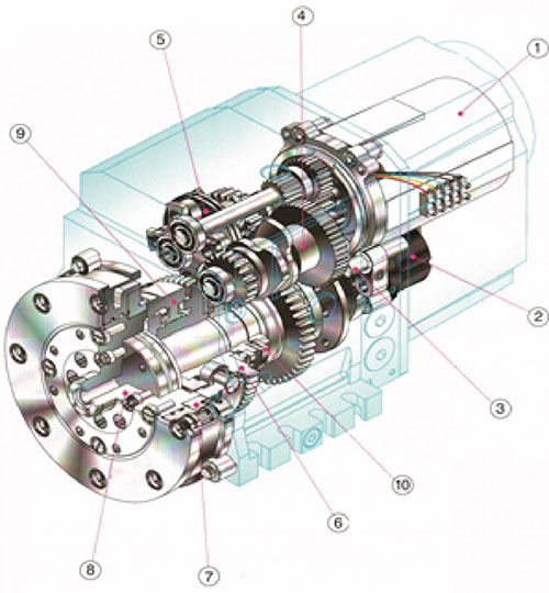 1. Электродвигатель. 2. Датчик положения. 3. Бесконтактный датчик. 4. Распределительный вал. 5. Механизм типа «мальтийский крест». 6. Кулачковый механизм. 7. Зубчатая муфта. 8. Фланец. 9. Скользящая муфта. 10. Тарельчатая пружина.