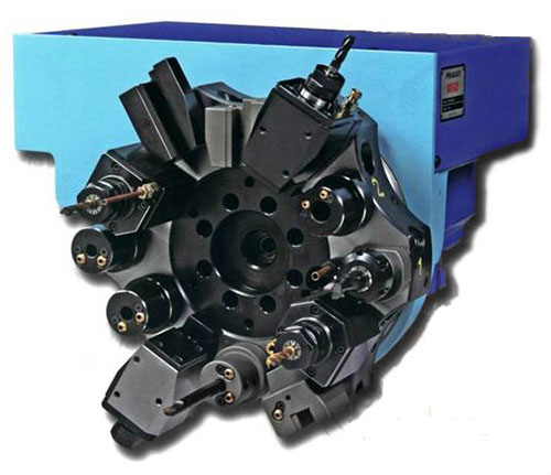 Головки типа DTT (рис. 3) оснащены дополнительно двигателем для приводного инструмента и позволяют выполнять на токарных станках фрезеровку, обработку отверстий, несоосных осей шпинделя, обработку шпоночных пазов и другие операции. Выпускаются с высотой центра 63, 80 и 100 мм в восьми- и двенадцатитипозиционном вариантах.