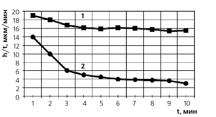 На рис. 5 представлена сравнительная зависимость эффективности работы двух типов инструмента: пористого РТ20 Р1 и монолитного РТ50. Как следует из приведенной графической зависимости, алмазный пористый инструмент с алмазным порошком фракции 20/14 имеет по сравнению с традиционным монолитным (непористым) инструментом с алмазным порошком 50/40 в 4 раза более высокую режущую способность. Это стало возможным благодаря резкому снижению удельного давления в зоне резания. Кроме того, шероховатость поверхности кремниевых подложек после обработки инструментом РТ20 Р1 составляет Ra=0,08 мкм, а при обработке инструментом РТ50—Ra=0,22 мкм.