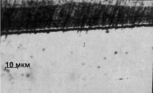 При использовании инструмента РТ20 Р1 на операции утонения кремниевых пластин со сформированными приборными кристаллами обеспечивается резкое снижение глубины нарушенного слоя. На рис. 6 представленымикрофотографии косых шлифов (1,50) кремниевой подложки после шлифования нерабочей стороны на станке MPS-2R300 фирмы G&N по традиционной технологии с помощью алмазного инструмента зернистостью 45 мкм (а) и с помощью инструмента РТ20 Р1 (б).