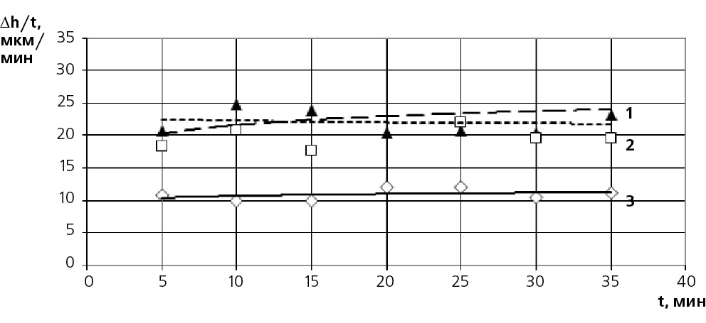 Рис. 7. Зависимость скорости съема латуни Л63 от времени шлифования инструментом РТ200 Р1 при удельных давлениях: 1–0.0157, 2–0.0108, 3–0.0056 МПа.