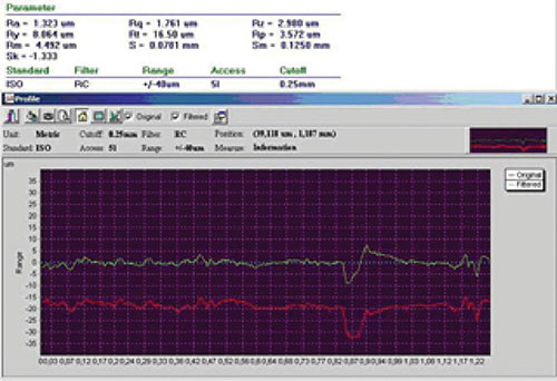 На рис. 8 показаны микрофотографии (100х) и шероховатость поверхности фильеры из нержавеющей стали 12Х21 Н5 Т после обработки по традиционной технологии алмазной пастой (а) и инструментом РРТ5 (б).