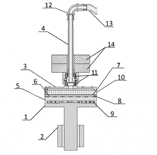 Кроме того, зоны фиксации пластин выполнены из материала 10 с микроотверстиями или порами для подачи вакуума через устройство перемещения шпинделя. Устройство перемещения шпинделя снабжено с одного конца вакуумно-плотными втулками 11, а с другого конца вращающимся вакуумно-плотным цанговым соединителем 12 с вакуумным шлангом 13. На устройстве перемещения шпинделя 4 соосно размещено устройство 14 для обеспечения относительной нагрузки обрабатываемой пластины 5 и алмазного инструмента 9. В частности, устройство нагружения 14 может быть выполнено в виде съемных грузов (рис. 8).