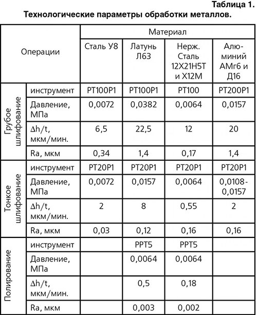 В таблице 1 приведены параметры обработки следующих металлов: высокоуглеродистая сталь У8, латунь Л63, нержавеющая сталь и алюминиевые сплавы АМг6 и Д16.