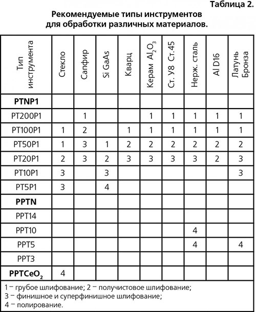 В таблице 2 приведены некоторые типы инструментов, рекомендуемых для обработки таких материалов, как стекло, сапфир, кремний, арсенид галлия, монокристаллический кварц, корундовая керамика, высокоуглеродистые стали У8 и Ст. 45, нержавеющая сталь, алюминий и его сплавы, медь и ее сплавы на операциях грубого, получистового и финишного шлифования, а также полирования.