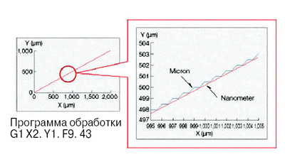Данная технология обеспечивает возможность обработки поверхностей с высочайшей точностью – вплоть до единиц нанометров. Все операции в ЧПУ от интерполяционных расчетов до управления приводами выполняются в нанометрах. Минимальный инкремент задания – 1 нм. Даже в случае задания в микронах внутренние расчеты выполняются с точностью до 1 нм.