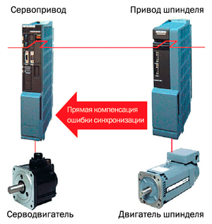 При выполнении синхронного резьбонарезания мечиком ось привода подачи непосредственно определяет и компенсирует задержку шпинделя, информация при этом передается непосредственно от привода к приводу по информационной оптической шине. Это позволяет увеличить до 25% производительность данной операции.