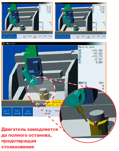 Для реализации данной функции используется математическая модель, которая отслеживает относительное положение детали и инструмента и позволяет предотвратить столкновение в случае ошибки технологической программы.