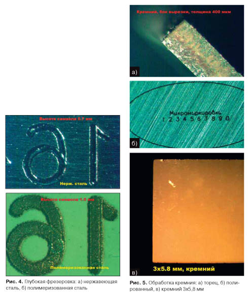 С этими же материалами проводились испытания по микрофрезеровке – области микрообработки, где лазерный метод имеет большое преимущество перед механическим и по производительности, и по минимально достижимым особенностям формируемой микроструктуры. Так, радиус скругления при ребре прямого двугранного угла может составлять при лазерной микрофрезеровке всего 10 – 15 мкм. Следует подчеркнуть, что речь идет об образцах, на которых не проводилась какаялибо механическая постобработка.