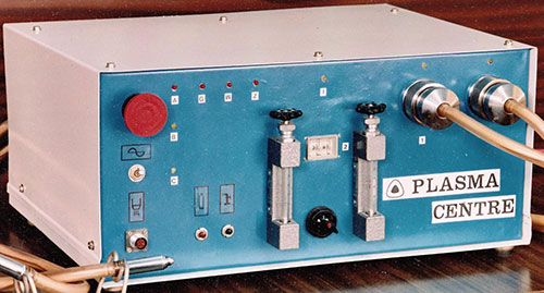 — блок аппаратуры для получения электрического разряда (1 кВА, 25 кГц, габариты — 590х530х250 мм, масса — 35 кг, питание — 100–250 В, 16 А, длина кабеля — 2,5 м), с модулем контроля вращения сопла плазмотрона и модулем контроля спектра плазменной струи — предназначен для преобразования сетевого в высокочастотное напряжение;