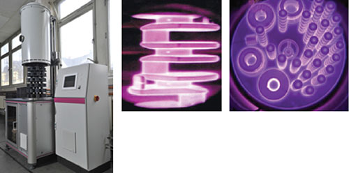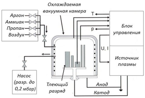 Наиболее востребован в мире процесс плазменного азотирования (азотирование в тлеющем разряде, ионно-плазменное азотирование) (рис. 6, 7). В качестве рабочих газов используются аммиак, аргон, пропан, природный газ и др. Регулирование и управление технологическим процессом полностью автоматизировано и осуществляется по заданной технологической программе. В водоохлаждаемой камере смонтировано смотровое окно для визуального наблюдения за процессом.