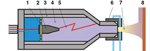 Рис. 1. Схема плазмотрона для активации и очистки поверхности, где 1 — распределитель газа; 2 — электрод; 3 — изолятор; 4 — разрядная камера; 5 — поджигающий разряд; 6 — насадка для подвода дополнительных паров материалов (прекурсоров); 7 — плазменная струя; 8 — подложка (изделие).