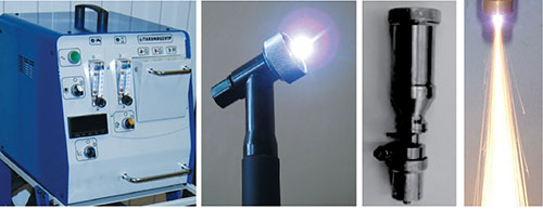 Комплекс основного оборудования для микроплазменного напыления (блок аппаратуры, плазмотрон, порошковый дозатор) и вид плазменной струи показаны на рис. 10.