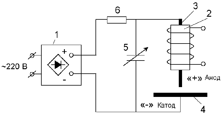 Рис. 4. Принципиальная схема плазменно-искрового нанесения покрытий, где 1 — генератор импульса тока; 2 — вибратор; 3 — электрод; 4 — изделие; 5 — конденсатор; 6 — сопротивление.