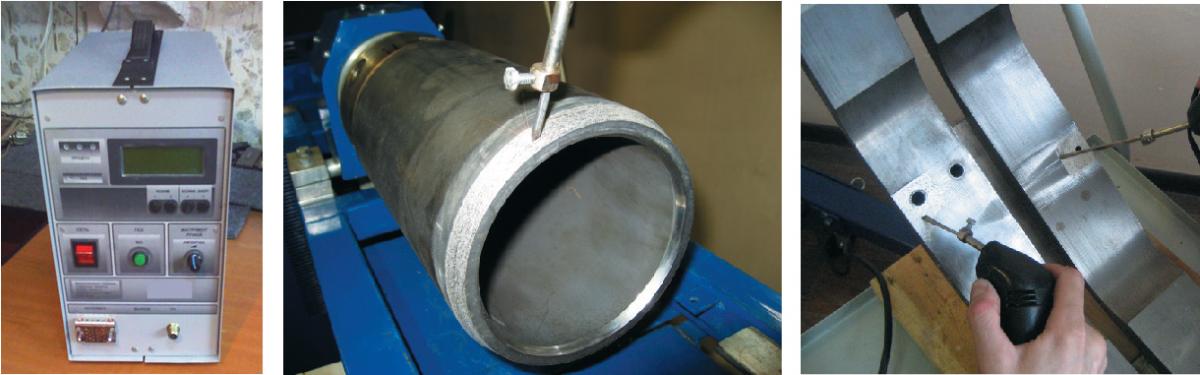 Рис. 5. Установка для плазменно-искрового нанесения покрытий (а), нанесение износостойкого покрытия из сплава ВК8 (б), нанесение электропроводящего серебряного покрытия (в).