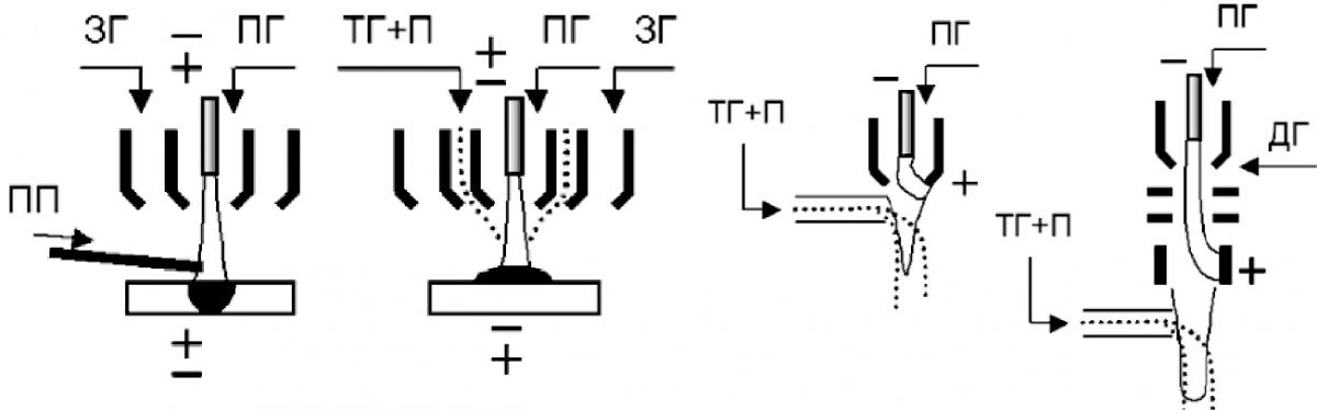 Рис. 8. Схемы плазмотронов для сварки (а), наплавки (а, б), напыления (в, г), финишного плазменного упрочнения (г), микроплазменной обработки (в — без П и ТГ); газы: ПГ — плазмообразующий, ЗГ — защитный, ТГ — транспортирующий, ДГ — дополнительный; ПП — присадочная проволока; П — порошок или реагенты упрочнения.