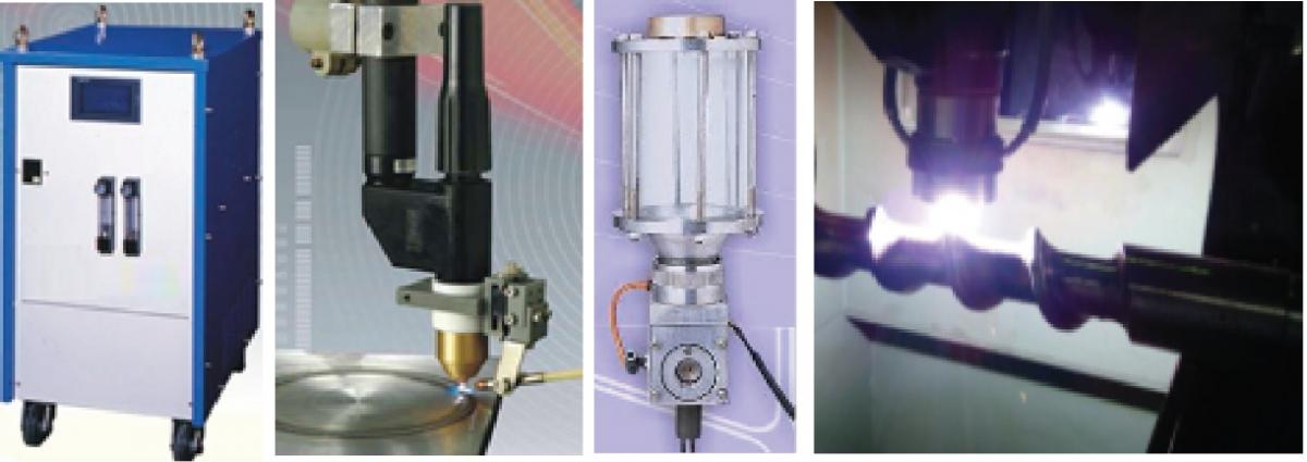 Рис. 9. Комплекс основного оборудования (блок аппаратуры, плазмотрон, порошковый дозатор) для плазменной наплавки-напыления и процесс нанесения покрытия на шнек.