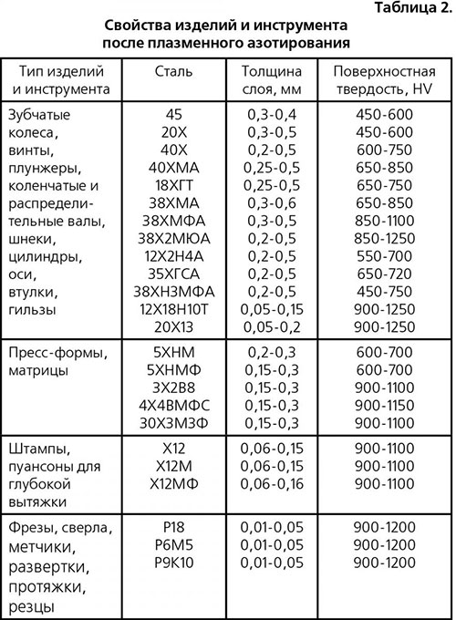 В таблице 2 приведены отдельные типы изделий и инструмента, а также свойства поверхности после плазменного азотирования.