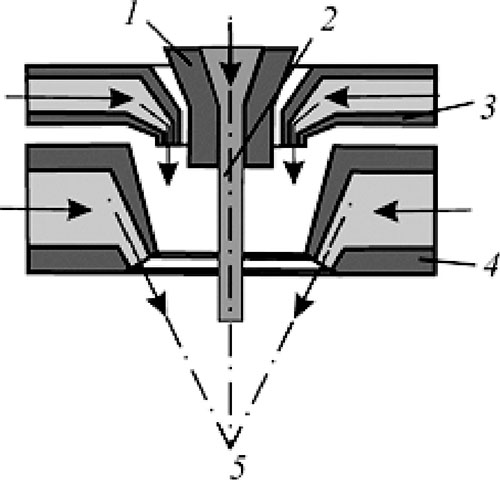Рис. 1. Типовая конструкция распылителя: 1 — сопло для подачи расплава; 2 — расплав; 3 — первичное сопло; 4 — вторичное сопло; точка пересечения потоков газа.