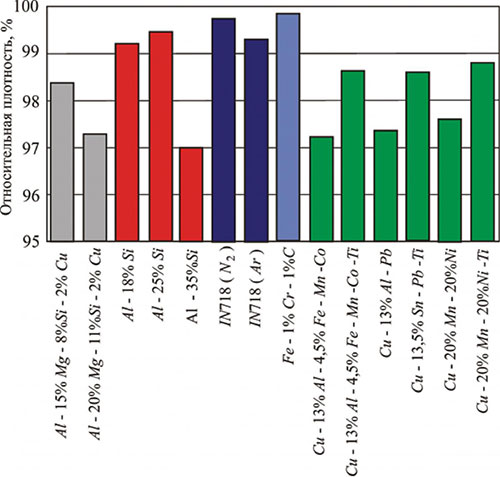 Рис. 12. Относительная плотность заготовок полученных спрейным литьем.