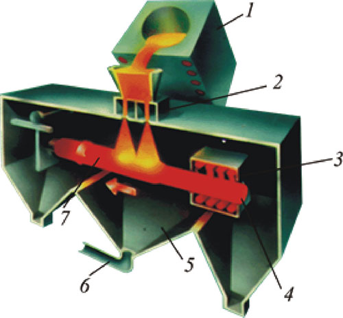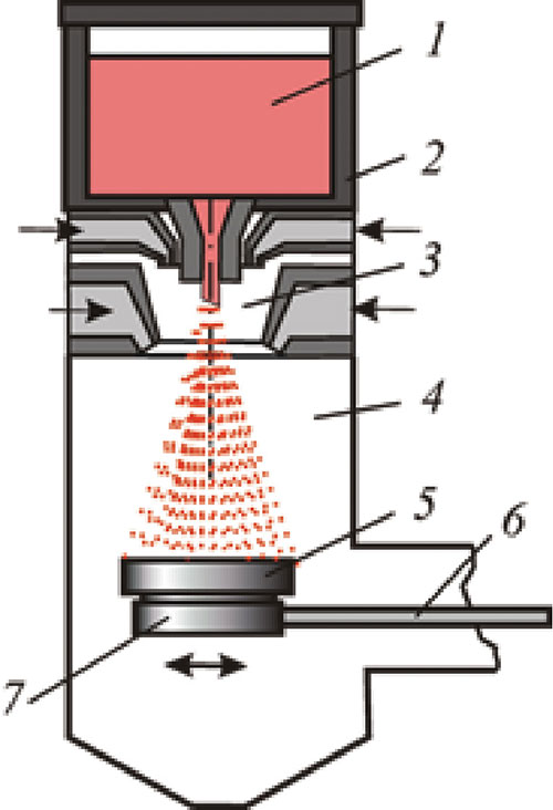 Рис. 2. Базовая схема спрейного литья: 1 — расплавленный металл; 2 — индукционная печь; 3 — распылитель (атомизатор); 4 — рабочая камера; 5 — форма (изложница); 6 — манипулятор; 7 — охлаждаемый коллектор.