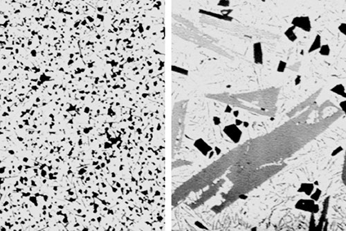 Рис. 3. Микроструктуры сплава Al-20Si-5Fe: а — спрейное литье; б — традиционное литье (в песчаные формы).