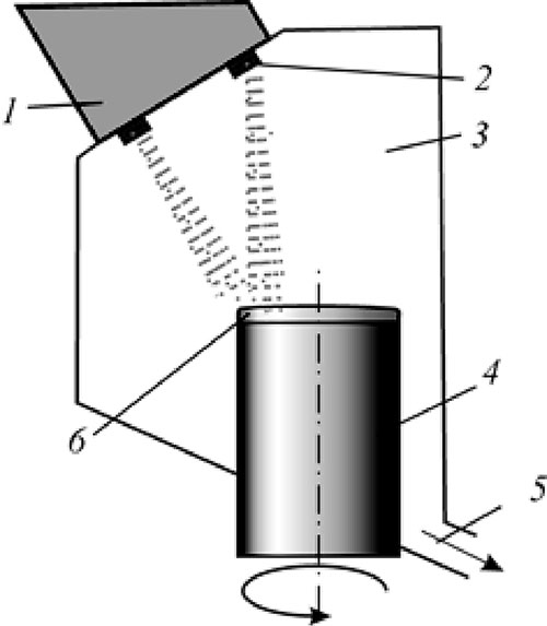 Рис. 6. Схема спрейного литья: 1 — расплавляемый стержень; 2 — расплав; 3 — сопло; 4 — отливка; 5 — керамическая или графитовая форма. 6 — манипулятор.