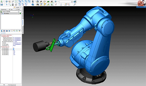 Интерактивные средства управления положением суставов робота и управление наклоном оси инструмента в любой точке траектории позволяют ввести корректировку рабочего задания и получить безопасную программу обработки детали.
