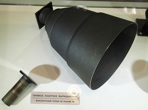 Центры аддитивных технологий работают и на базе технических университетов МГТУ «Станкин», МГТУ им. Н. Э. Баумана, ФГУП НАМИ, СПбПУ, участвуя в разработке оборудования и технологий. Например, институт лазерных и сварочных технологий СПбПУ (ИЛиСТ) ведет разработку технологии высокоскоростного изготовления деталей и компонентов авиационных двигателей методами гетерофазной порошковой металлургии. Разрабатываемая технология (технология прямого лазерного выращивания) производительнее технологий послойного синтеза в десятки раз, обеспечивает получение изделий с механическими характеристиками на уровне деформируемых сплавов и не требует последующего газостатирования. Высокие производительность и коэффициент использования материала позволяет значительно снизить длительность производственного процесса и конечную себестоимость выпускаемых изделий по сравнению с традиционными технологиями литья и последующей механообработки. Также становится возможным получение изделий с градиентными свойствами за счет изменения в процессе выращивания химического состава подаваемых в зону лазерного воздействия порошков. Возможность перемещения технологической головки относительно изделия с помощью роботизированных манипуляторов, а также высокая производительность процесса, позволяет выращивать крупногабаритные изделия. По экспертной оценке ОАО «ОДК», приведенной директором ИЛиСТ Г. А. Туричиным, потребность в машинах прямого лазерного выращивания для авиастроения, космической техники, судостроения, энергетики и других отраслей составляет почти 300 машин. Наиболее востребована технология в настоящее время в авиастроении (до 240 машин). На выставке «Металлообработка–2015» посетители увидели образцы, полученные методом прямого лазерного выращивания на разработанном в ИЛиСТ экспериментальном технологическом комплексе (рис. 2, 3).