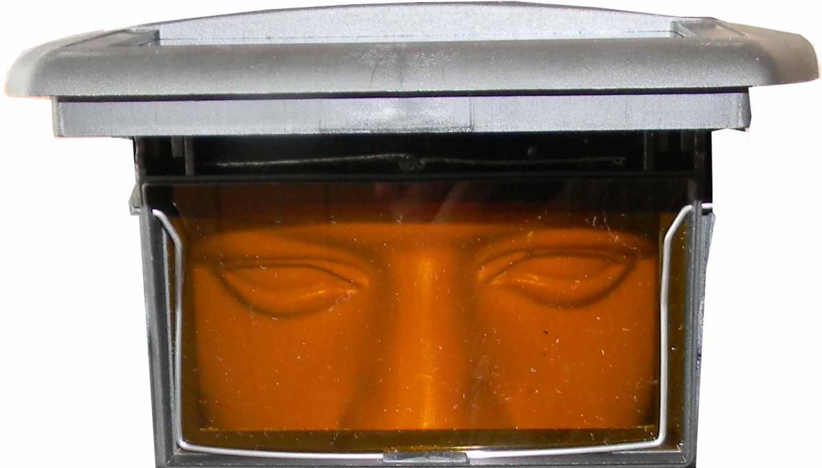 Светофильтр помещен в противоударную рамку, которая имеет три положения под разным углом обзора так, чтобы, меняя угол положения головы, можно было смотреть в щель снизу за положением электрода перед сваркой и, наклонив голову немного вниз, сразу начать сварку, наблюдая за процессом уже через сварочный светофильтр. За сварочным располагается защитное стекло, необходимое при проведении процессов зачистки сварного соединения, настройки режимов или измерений. Оно также задерживает ультрафиолетовое излучение, наносящий самый большой вред зрению. С таким стеклом не так страшно поймать «зайчика». Кроме того, оно имеет светло-желтый цвет, наподобие очков «антифара», переводящий лучи в более чувствительный спектр. Это позволяет в малоосвещенных помещениях более четко видеть окружающие предметы. Картридж со светофильтрами компактен, располагается близко к глазам, что повышает доступность сварщика в узкие места. Для увеличения обзорности использованы более широкие защитные стекла.