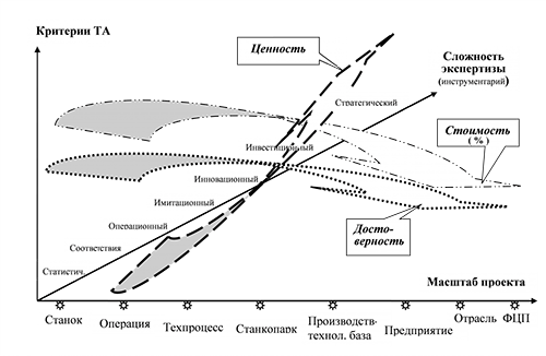 Эффективность техаудита оценивается такими критериями: 1. Ценность (значимость) полученных данных для целей проекта. 2. Качество (достоверность и адекватность) результатов. 3. Стоимость услуги. На эти критерии влияют «Масштаб проекта» и «Сложность экспертизы». Первый параметр включает уровни: 1-станок; 2-операция; 3-техпроцесс; 4-станкопарк; 5-производственно-технологическая база (ПТБ) (модернизационный аспект); 6-инфраструктура предприятия (техперевооружение, программы развития); 7-отрасль, ФЦП (инвестиционный проект). Параметр «Сложность экспертизы» включает стадии: 1-статистическая; 2-соответствие (нормы и регламенты); 3-операционная (технологическая); 4-имитационная (MES); 5-инновационная (наукоемкая); 6-инвестиционная (ТЭО, риски); 7-стратегическая (конкурентоспособность и менеджмент) (рис. 4). На рисунке показано влияние перечисленных факторов на выходные критерии техаудита. При этом техэкспертиза должна быть строго целеориентирована.