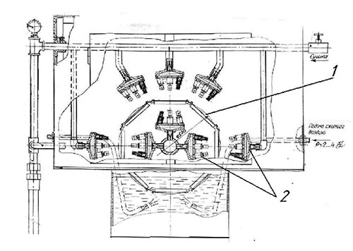 Кассеты с приборными подшипниками размещали на вращающемся барабане 1, внутри и снаружи которого были расположены моющие форсунки 2.