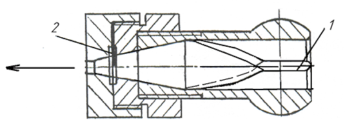Рис. 5. Схема форсунки: 1 - завихритель струи; 2 - упругий пульсатор